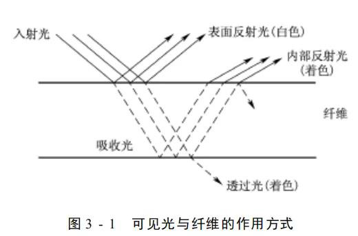 纖維可看成是半透明物體, 部分光可進(jìn)入纖維內(nèi)部, 在內(nèi)部主要發(fā)生吸收、散射或發(fā)射熒光。吸收主要由染料和光發(fā)生互相作用, 即發(fā)生選擇吸收, 互補(bǔ)光被漫反射或透過纖維, 使纖維呈現(xiàn)顏色, 未被吸收的光則在纖維內(nèi)部發(fā)生散射, 部分光也透射出來。