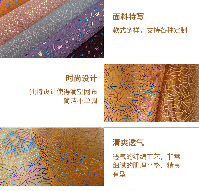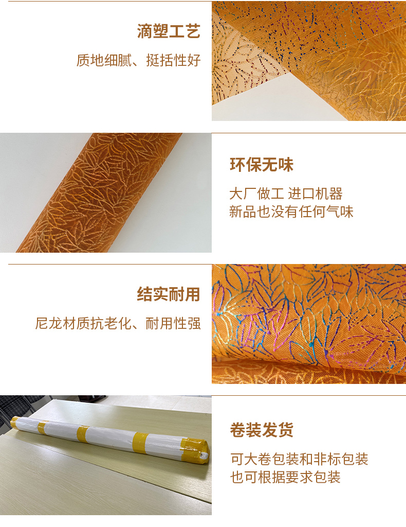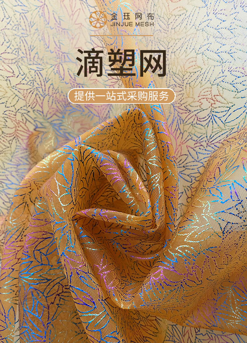 滴水塑料婚紗網是本公司婚紗網布面料中的一種高檔網布,其特點是新穎、美觀、明亮、時尚。 優點是顏色鮮艷、不掉色、輕便、抗老化、強度高、回彈快、透氣、防水、耐油等。他做的產品非常適合盛大的場合,比如婚紗、鞋網、 袋子等等。