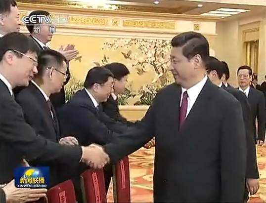 5月17日,黨和國(guó)家領(lǐng)導(dǎo)人習(xí)近平、李克強(qiáng)、劉云山、張高麗等在北京人民大會(huì)堂會(huì)見載人深潛先進(jìn)單位和先進(jìn)工作者代表。圖為習(xí)近平與王越超親切握手。