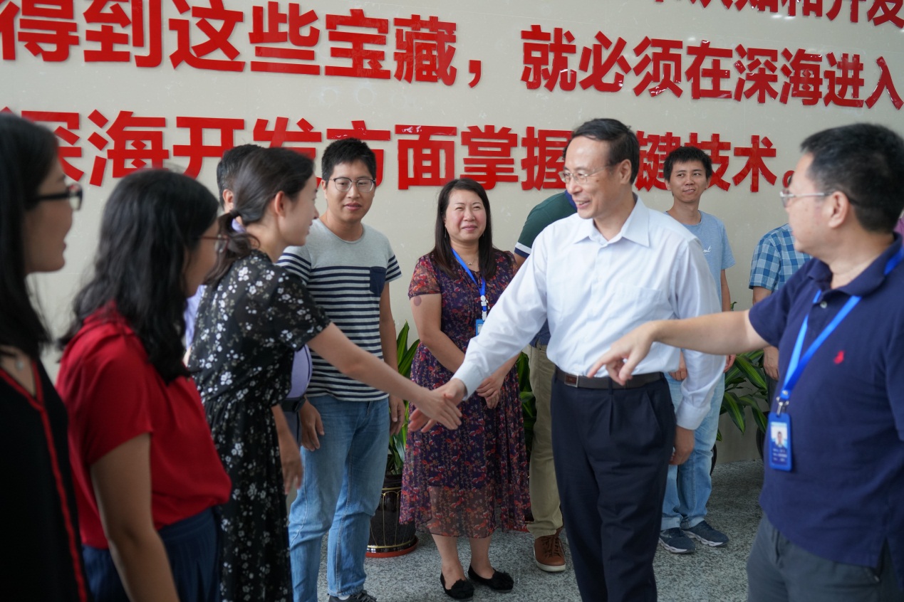 萬立駿一行實(shí)地查看了各型深海科考裝備,了解研究所概況和未來發(fā)展方向,并觀看海試宣傳片。隨后,在綜合樓大廳接見了該所歸國留學(xué)人員代表。