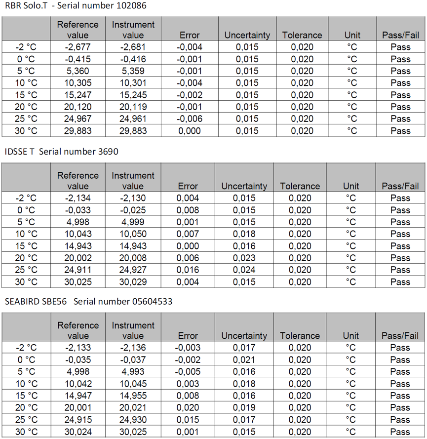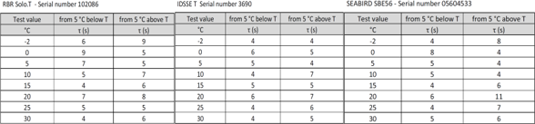 20186月開始,Trescal機構選取了海鳥(SBE 56)RBR (Solo.T)NKE(S2T)NKE(WiSens)等國際上知名海洋傳感器制造商供應的同類溫度傳感器,進行比測試驗,在長達24周的測試期內,分別完成了測量精度、響應時間等一系列性能測試。測試結果顯示:RBR Solo.TIDSSE TSBE 56的測量誤差均不超過±0.020℃,其中RBR Solo.T的最大誤差為-0.006℃IDSSE T的最大誤差為0.016℃SBE 56的最大誤差為0.020℃;在響應時間測試中,RBR Solo.TIDSSE TSBE 56的系統整機響應時間均維持在11s以內,測試結果比對圖如下: