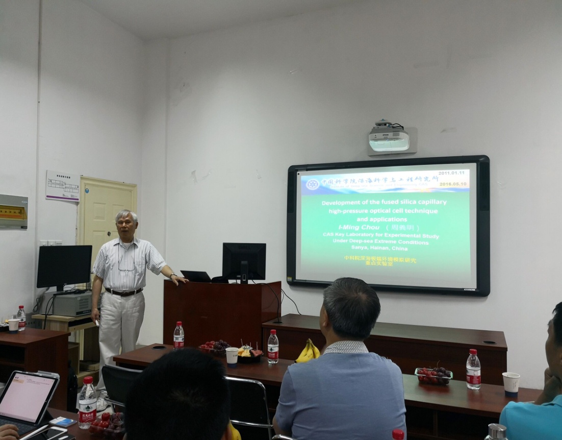 報告中,周義明研究員介紹了高壓微型可視毛細硅管與拉曼光譜聯用技術的研發歷史背景及多位從中國到美國地質調查局其實驗室參與初期研發工作的訪問學者的貢獻,同時也介紹了目前在深海極端環境模擬研究實驗室的主要工作內容及面對的挑戰和前景。目前,此高壓微型可視毛細硅管與拉曼光譜聯用技術已被廣泛的應用到與地質及環保相關的流體研究,主要包括在中國、美國、加拿大、法國、及澳大利亞的科研機構。其他多位與會者及前訪問學者也介紹了他們在這方面的科研進展并熱烈地參與交流討論。