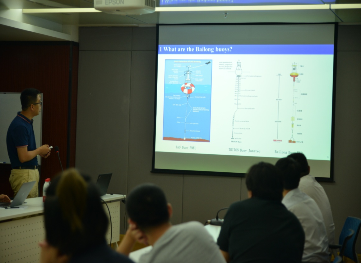報告中,于衛東研究員就季風的季節循環、季節內震蕩、季風爆發和熱帶氣旋等問題展開闡述,指出了季風預報的困難性。寧春林研究員則分別闡述了白龍浮標的結構、工作原理、使用流程、數據采集過程以及目前的布放次數與獲取的數據。報告引起了所內不同學科科研人員極大的興趣,會后進行了熱烈的討論。