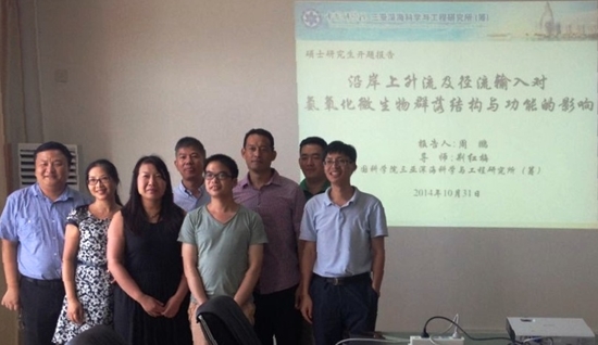 本次評審小組由香港科技大學劉紅斌教授、廈門大學高樹基教授,以及三亞深海所徐洪周、張海濱、荊紅梅研究員組成。首先,考核小組組長劉紅斌教授介紹了碩士生周鵬的基本情況,隨后周鵬做了題為“沿岸上升流及徑流輸入對氨氧化微生物群落結構與功能的影響”的開題報告,考核小組就報告內容進行了提問。