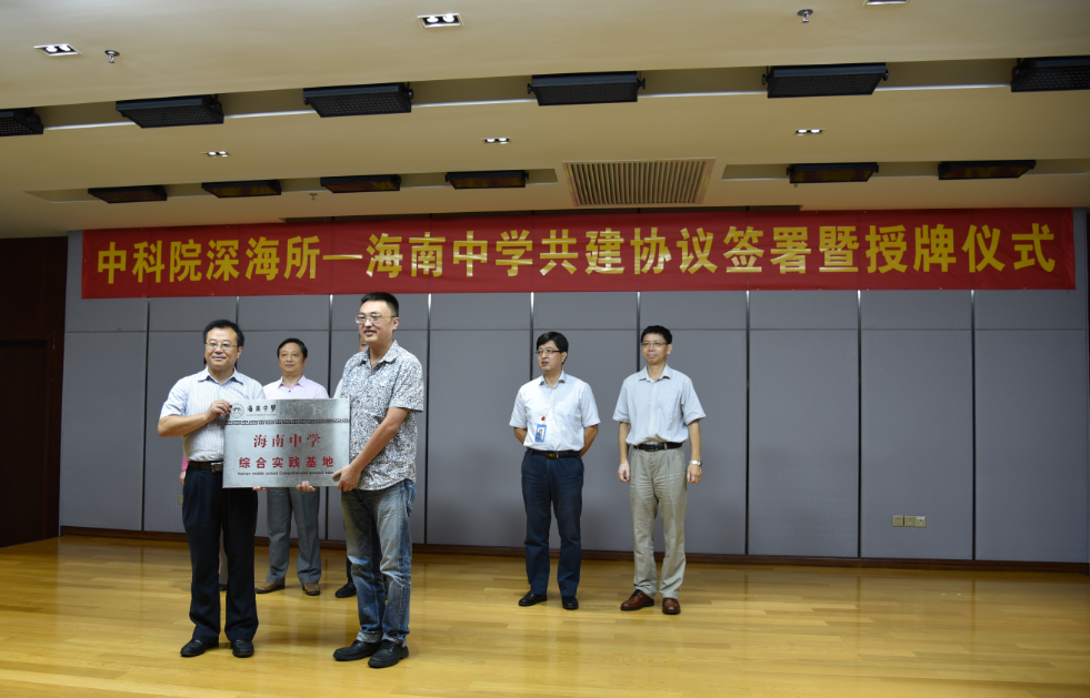 2016年11月24日,深海所與海南中學順利簽署合作共建協議暨 “海南中學綜合實踐基地” 授牌儀式。深海所副所長代亮、海南中學副校長林洪珊、三亞市教育局局長陳鵬程分別致辭。深海所副所長謝強、所長助理張忠,海南中學校長馬向陽、副校長陳輝等領導及開展社會實踐活動的高二部分老師、學生參加了協議簽署與授牌儀式。