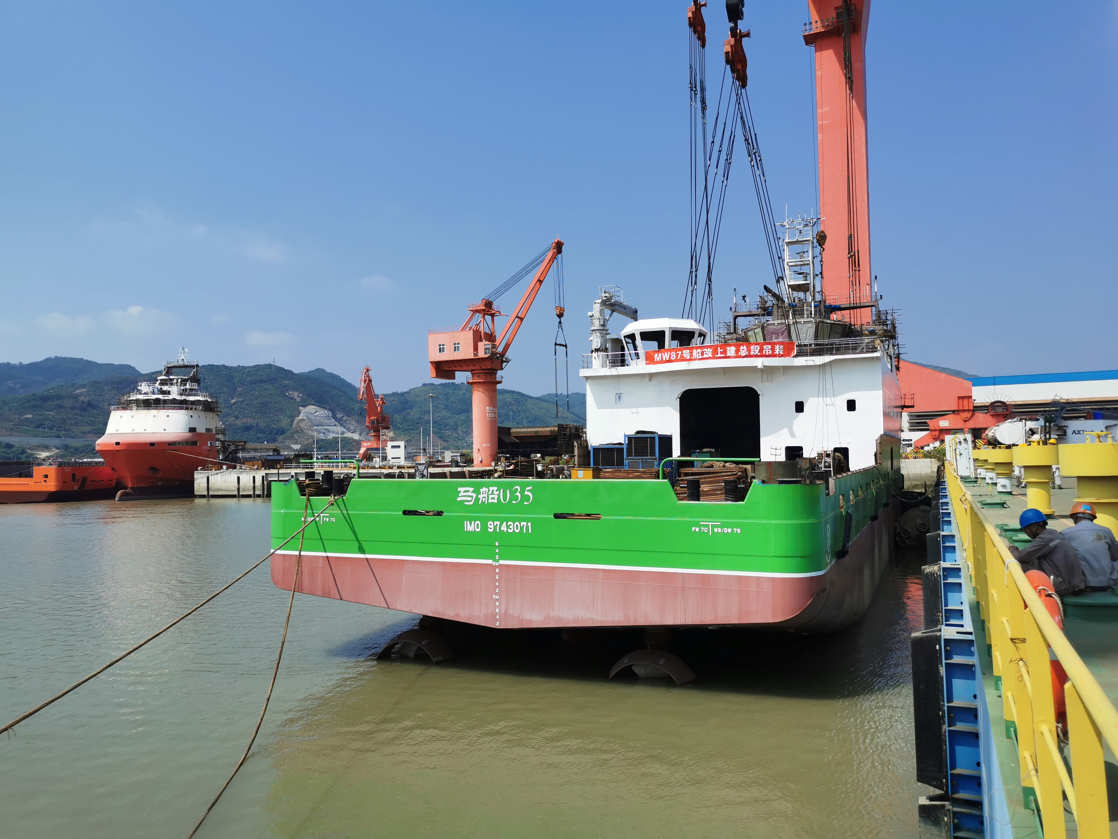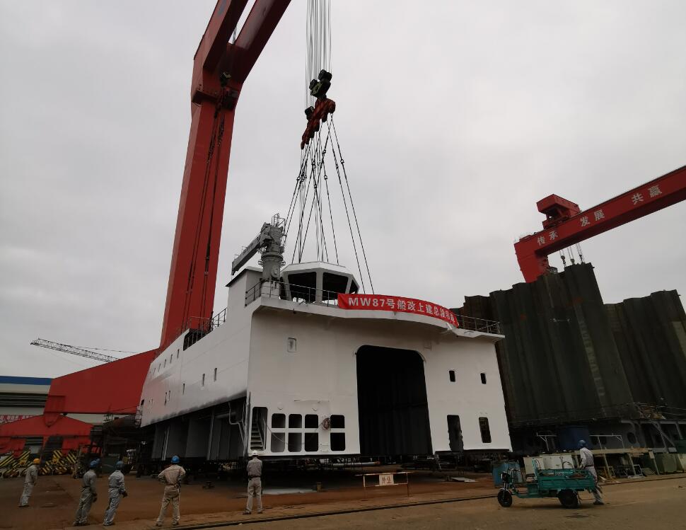 10月10日上午,福建馬尾船廠,萬米載人潛水器支持保障母船MW87號(暫定名)順利完成上建總段吊裝,這標(biāo)志著該船主體結(jié)構(gòu)建造完成、科考設(shè)備及其科學(xué)與工程實驗室等改造布局已確定,是船舶建造改造的關(guān)鍵節(jié)點之一。