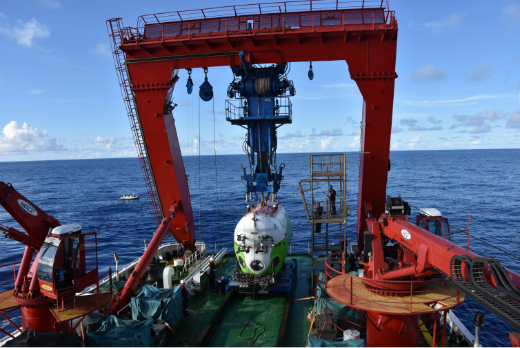 “奮斗者”號即將從“探索一號”甲板布放