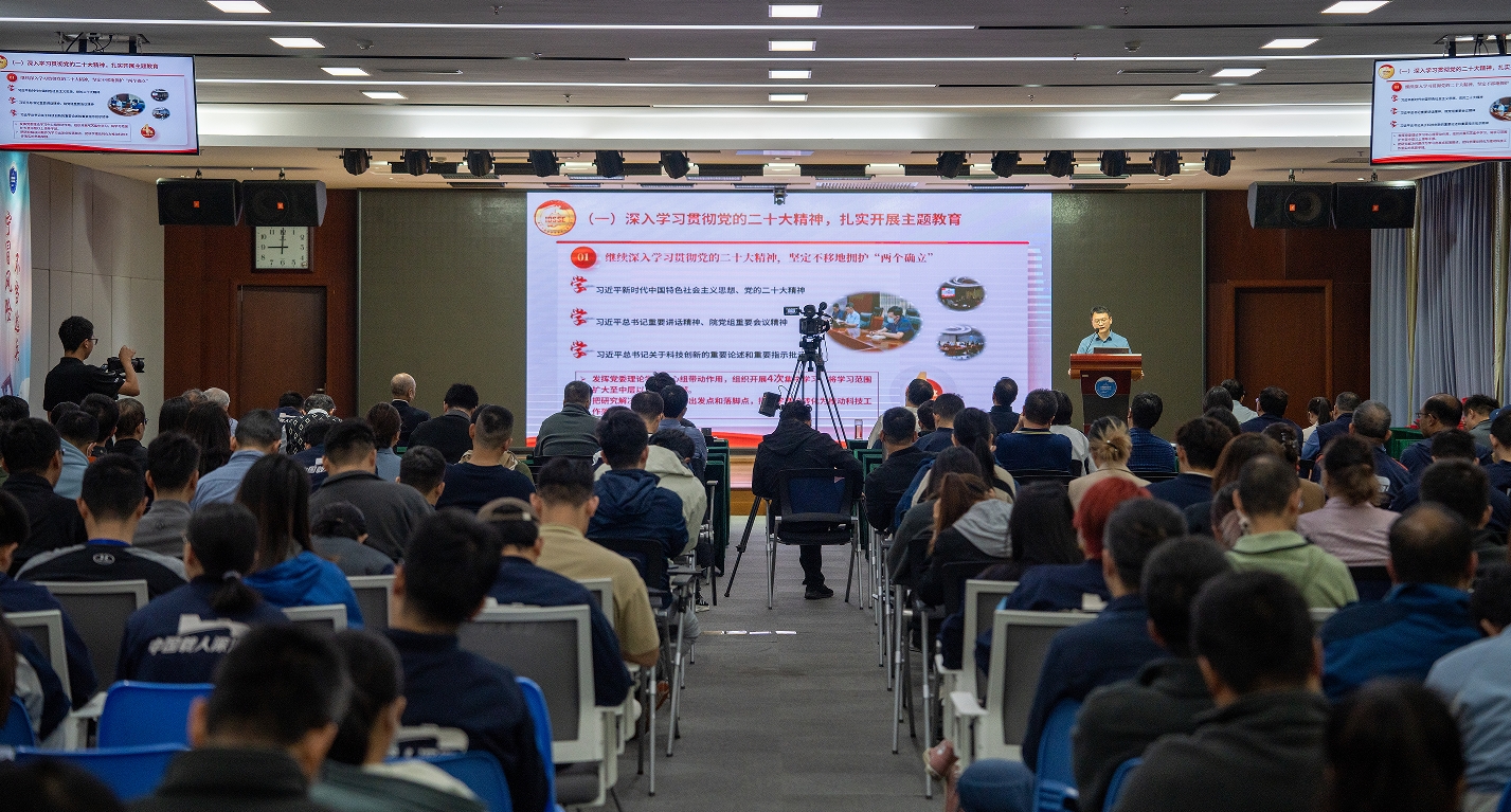 會議分工作總結與表彰兩個環節??偨Y環節由副所長蔣磊主持。資產財務處處長汪瀚濤作2023年度財務報告,黨委書記彭曉彤代表所黨委作2023年度黨建工作報告,所長丁抗代表所領導班子作2023年度工作總結報告。