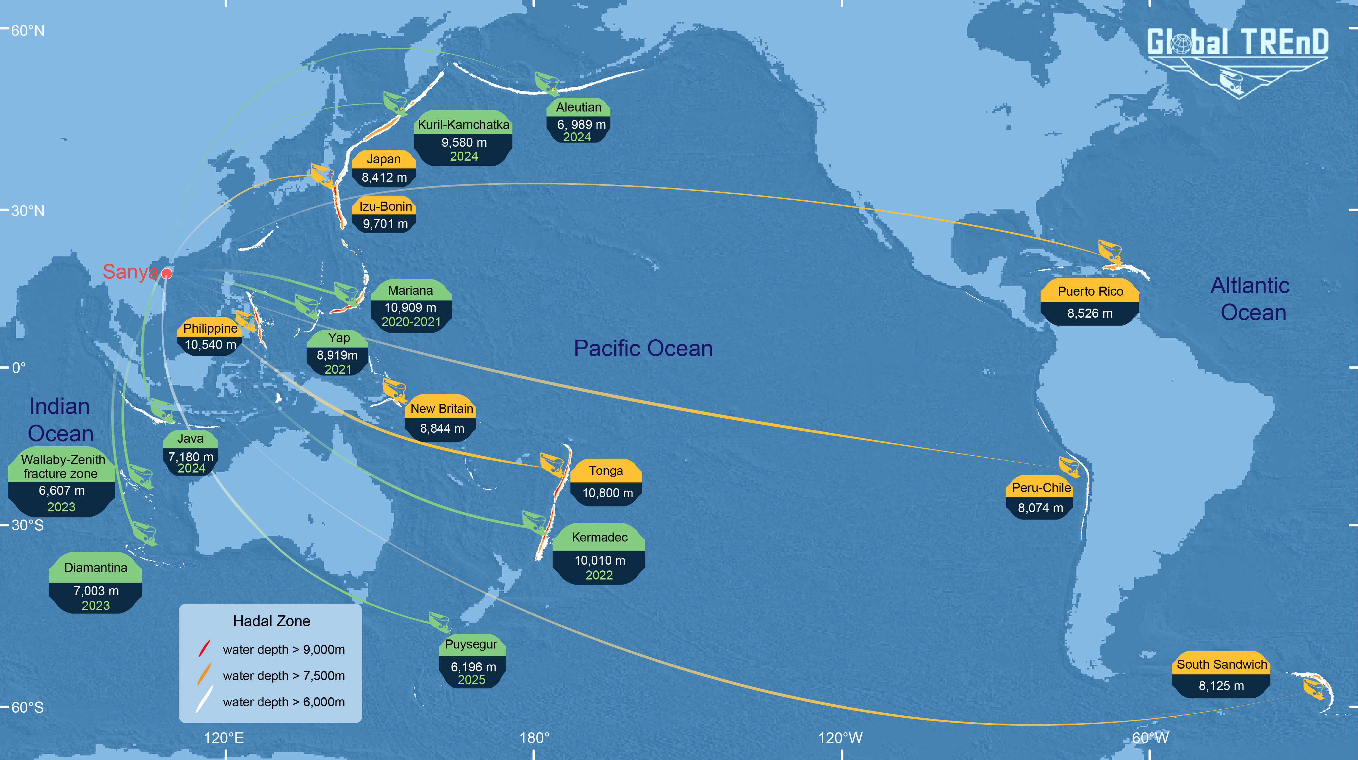 依托國際上唯一的強作業能力萬米載人潛水器“奮斗者”號以及“探索”系列科考船為全球深淵科考平臺,中國科學院部署啟動“全球深淵深潛探索計劃(Global TREnD)”,中國科學院深??茖W與工程研究所(簡稱“深海所”)作為該計劃的牽頭單位,進一步開展多國聯合、多學科綜合深潛考察。該計劃得到了來自新西蘭、智利、丹麥、印度尼西亞、巴西、德國等10多個國家的參與和支持,已對馬里亞納、雅浦、克馬德克、蒂阿曼蒂那、瓦萊比-熱恩斯、爪哇、千葉-勘察加、阿留申、普伊斯哥等九條全球主要海溝深淵進行了載人深潛科考,取得一系列原創性科學發現,創造多項世界載人深潛作業紀錄。