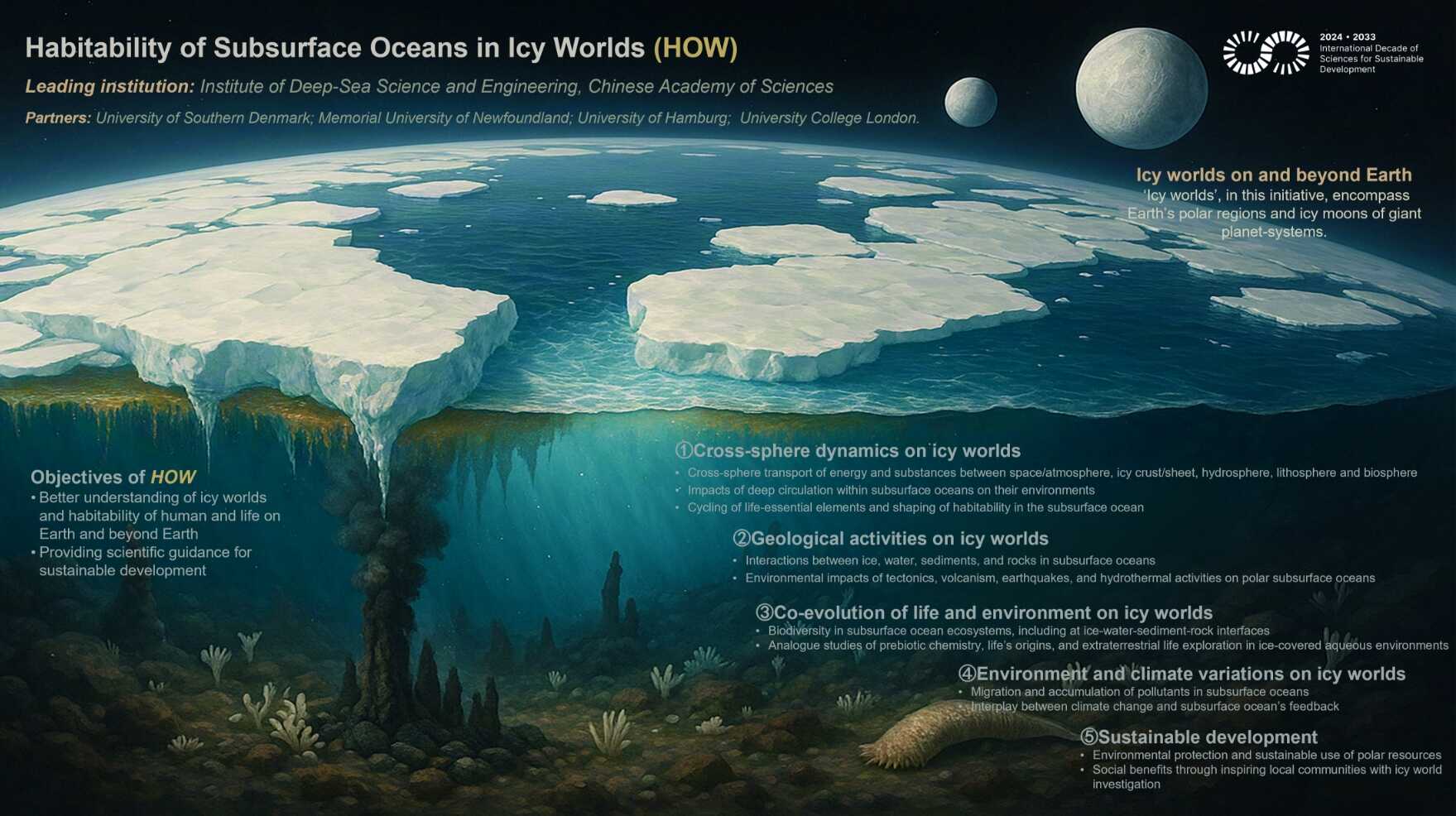 5月5日,由中國科學院深海科學與工程研究所(簡稱深海所)牽頭的國際大科學計劃“Habitability of Subsurface Oceans in Icy Worlds (HOW)”獲得聯合國教科文組織(UNESCO)可持續發展國際科學十年(International Decade of Sciences for Sustainable Development, IDSSD)執行委員會批準。