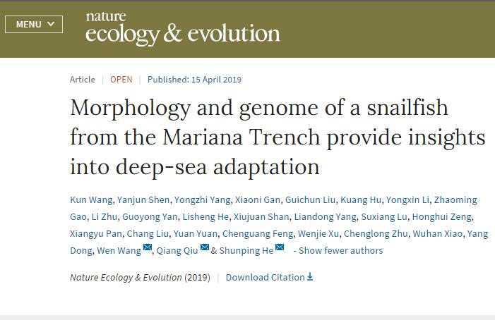 中國科學院深海科學與工程研究所和水生生物研究所與西北工業(yè)大學聯(lián)合攻關(guān),對生活在馬里亞納海溝7000米以下的獅子魚開展了多方面的深入研究,在分類學上厘清了其系統(tǒng)地位,首次在形態(tài)上發(fā)現(xiàn)其適應(yīng)深淵的變化,在多組學大數(shù)據(jù)分析的基礎(chǔ)上揭示了深淵適應(yīng)的遺傳基礎(chǔ)。北京時間4月15日23時許,該研究成果在線發(fā)表于英國自然雜志子刊Nature Ecology & Evolution(自然-生態(tài)與進化),題為《Morphology and genome of a snailfish from the Mariana Trench provide insights into deep-sea adaptation》。深海所為第一作者單位和第一通訊作者單位。