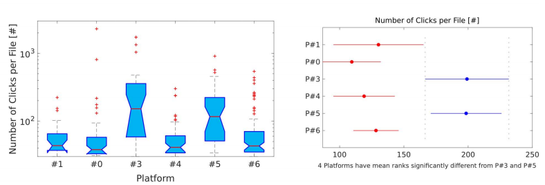 4 (左)被動聲學監(jiān)測位點和平臺(右)被動聲學監(jiān)測位點中每個文件檢測到的回聲定位信號次數和位點之間的差異