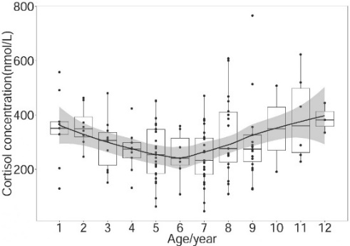 5.2020511日,期刊Aquatic Mammals在線發(fā)表了題為“Aging and Seasonal Serum Cortisol Concentrations in Captive Spotted Seals (Phoca largha) from the Liaodong Bay Colony”的文章。研究團隊對遼東灣人工養(yǎng)殖斑海豹皮質醇濃度積聚規(guī)律進行了分析并探討其在生殖周期中生理狀態(tài)的變化。研究表明,斑海豹皮質醇水平隨年齡的增長緩慢降低并以6歲作為轉折點后緩慢升高(圖5 左);在性成熟和非性成熟期間,不同性別間皮質醇濃度并無顯著差異,但在不同季節(jié)皮質醇濃度存在顯著差異(圖5 右)。本研究為判斷野生斑海豹健康狀況建立了一個參考標準,同時可以用作評估其受自然或人為脅迫的壓力響應。