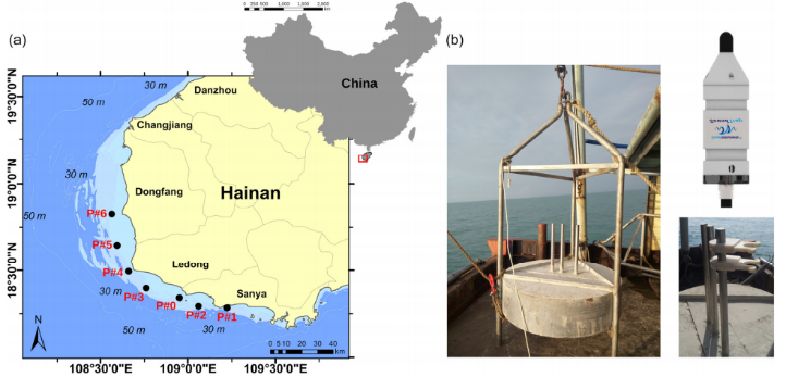 4.2020428日,期刊Frontiers in Marine Science在線發(fā)表了題為“Monitoring of a nearshore small dolphin species using passive acoustic platforms and supervised machine learning techniques”的文章。研究團隊探討了水下聲學平臺陣列(圖4左)所記錄的聲學數據是否可以用于中華白海豚回聲定位信號的識別,進一步研究了該種群的時空分布模式和聲學行為。研究表明利用被動聲學平臺陣列獲取的聲學數據,采用機器學習技術和聲譜圖檢查結合的方法,可以在大時空尺度上監(jiān)測沿海棲息的海豚物種的分布和棲息地使用情況(圖4右),為進一步監(jiān)測和研究近海鯨類動物提供了新思路。