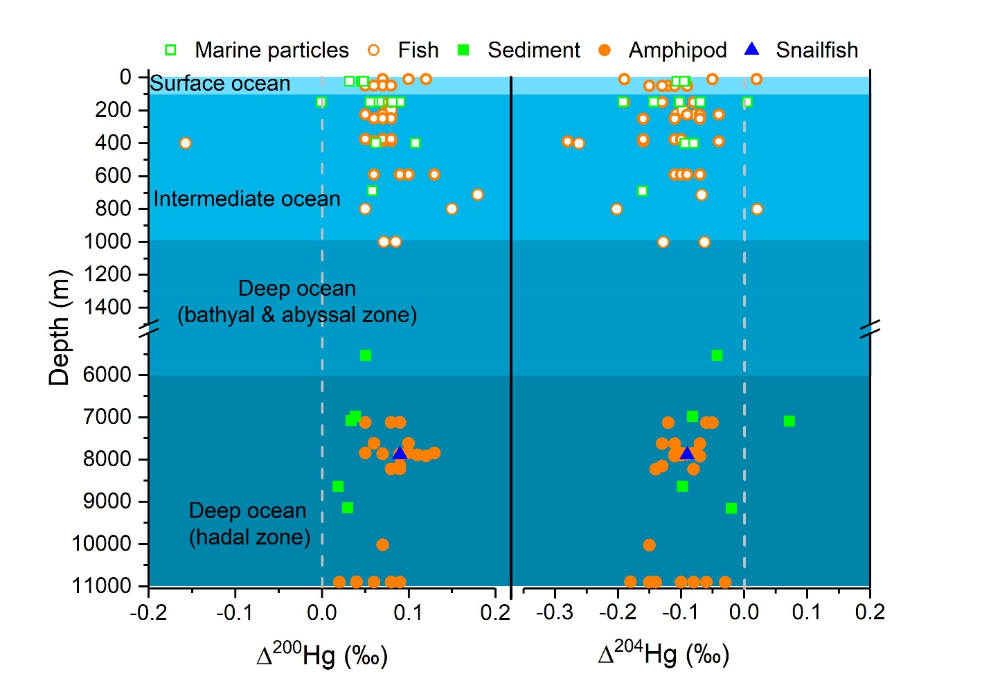 1 北太平洋區域樣品中偶數汞同位素非質量分餾值隨水深的變化。