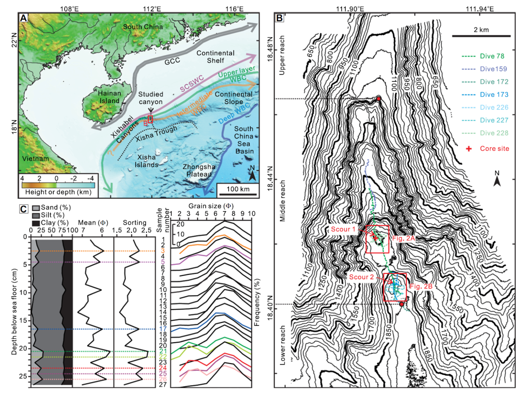 (A)南海西北部海底地形、海流分布及西沙北海底峽谷位置示意圖(底圖據(jù)廣州海洋地質(zhì)調(diào)查局,2015)
