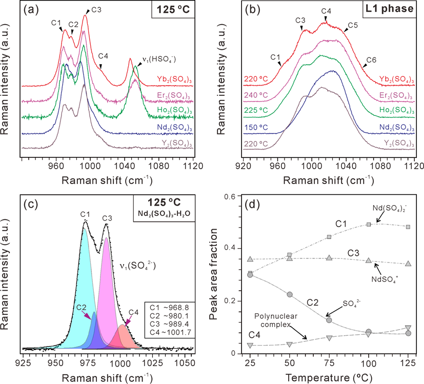 應用原位拉曼光譜分析技術對高溫高壓條件下流體的組成和結構進行了在線分析。結果表明,除了前人報道的REESO4+和REE(SO4)2–外 (C3, C1),REE3+與SO42-可形成更為復雜的絡合物(REEm(SO4)n3m-2n, m>1,C4, C5, C6) (圖2)。上述復雜絡合離子對的形成導致了熱液流體中液-液不混溶的發生。此外,HSO4–也可與REE3+直接絡合并遷移REE (圖2)。