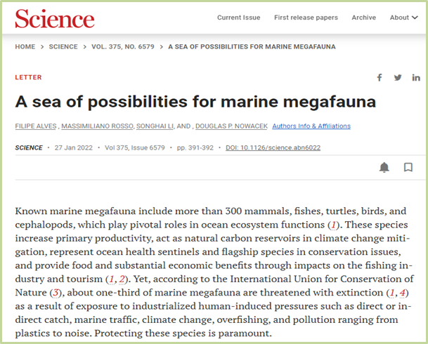 2022年1月27日,來自中國科學院深海科學與工程研究所、美國杜克大學海洋實驗室、葡萄牙海洋與環境科學中心MARE以及意大利國際環境監測中心CIMA等多家國內外科研機構的科學家,聯名在期刊Science發表了題為“A sea of possibilities for marine megafauna”Letter文章,旨在共同呼吁加強對海洋大型動物的研究和保護工作。