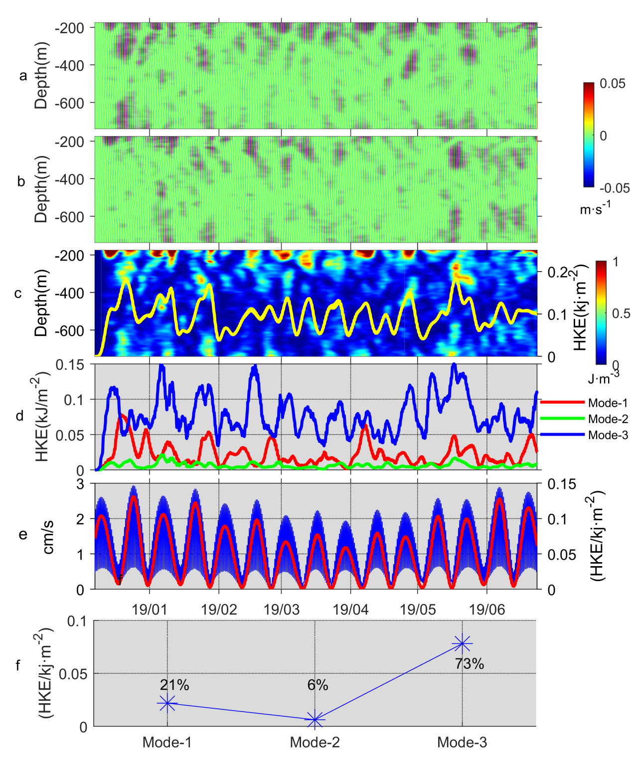 另外,利用南沙海域2018/2019年的錨系潛標(biāo)數(shù)據(jù),研究團(tuán)隊(duì)還研究了該海域內(nèi)潮和近慣性波的垂直分布和時(shí)間變化。研究結(jié)果表明,內(nèi)潮主要以O1、K1和M2分潮為主,其中全日內(nèi)潮最強(qiáng),其次為半日內(nèi)潮。與前人的研究發(fā)現(xiàn)不同,南沙海域的全日內(nèi)潮主要由mode-3模態(tài)主導(dǎo),而不是以前認(rèn)為mode-1模態(tài)(圖2)。半日內(nèi)潮的水平動(dòng)能則以mode-1模態(tài)為主,受背景環(huán)流場影響。在冬季風(fēng)期間,由于強(qiáng)風(fēng)強(qiáng)迫,近慣性能量振幅較大。此外,由于近慣性內(nèi)波的遙強(qiáng)迫,近慣性能量在當(dāng)年的3月中旬至4月初達(dá)到峰值。總體而言,該海域的近慣性能量主要集中在500-600米深度以上。 相關(guān)研究成果已發(fā)表于國際知名海洋學(xué)期刊《Frontiers in Marine Science》。