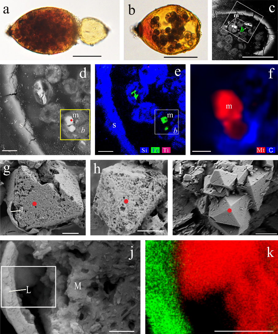 圖1 有孔蟲(chóng)R. bilocularis的磁鐵礦。(a) LM(光學(xué)顯微鏡)圖像顯示R. bilocularis具有鐵銹色外殼。(b) LM圖像顯示用孟加拉玫瑰紅染色的R. bilocularis腔室的新鮮球形組織stercomata(廢物球)和被染呈褐紅色的原生質(zhì)。(c) 來(lái)自挑戰(zhàn)者深淵的R. bilocularis樹(shù)脂薄片的SEM(掃描電鏡)圖像顯示有孔蟲(chóng)外殼(s)內(nèi)密集分布的廢物球(b),磁鐵礦(m)包含在廢物球中。(d) 圖(c)中白色矩形所示區(qū)域被放大的SEM圖像,磁鐵礦(m)包含在黃框內(nèi)的廢物球(b)中,拉曼分析位置用紅點(diǎn)標(biāo)記。(e) R. bilocularis的NanoSIMS(納米二次離子質(zhì)譜)元素分布圖,藍(lán)色=Si;綠色=Fe;紅色=Ti。(f) 含磁鐵礦的廢物球的拉曼光譜面分析。666 cm-1、538 cm-1、304 cm-1(紅色)和1367 cm-1、1582 cm-1(藍(lán)色)分別表示廢物球中的磁鐵礦和有機(jī)碳。(g-i) 從R. bilocularis中分離的磁鐵礦的掃描電鏡二次電子圖像,顯示磁鐵礦具有自形的八面體晶型和多孔狀結(jié)構(gòu),L=含碳膜。(j) 圖1g中包裹磁鐵礦的含碳膜被放大的SEM圖像。L=含碳膜,M=磁鐵礦。(k) 圖1j中白色矩形區(qū)域的元素分布圖,綠色=C;紅色=Fe。比例尺a, b = 50 μm, c = 20 μm, d, e = 8 μm, f–i = 2 μm, j, k = 0.5 μm。