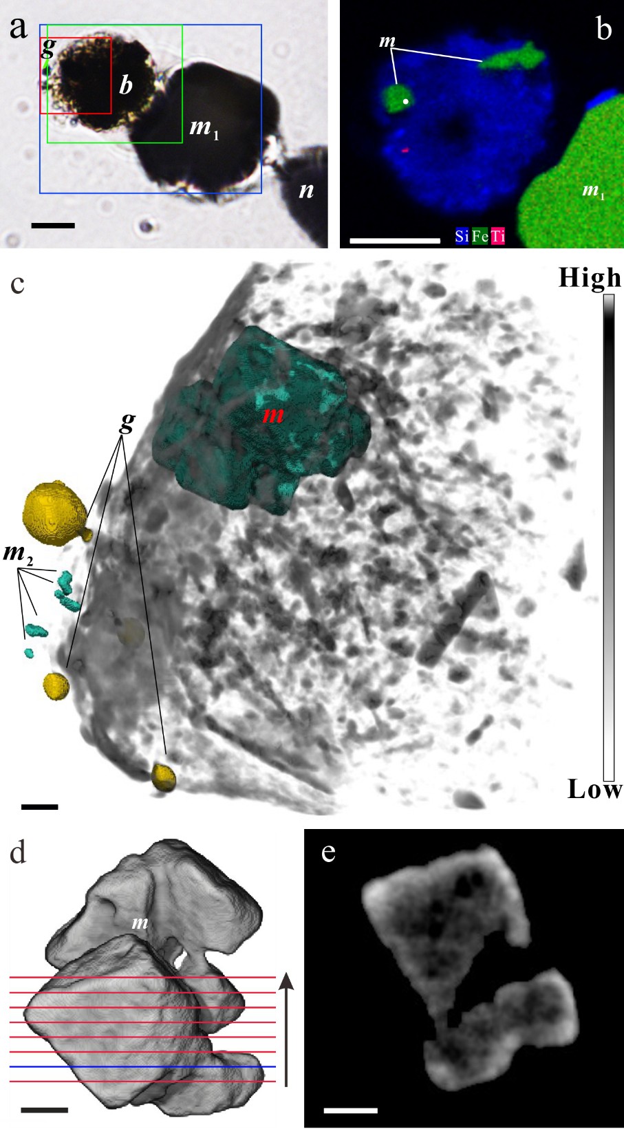 圖2 R. bilocularis的廢物球的同步輻射X硬射線計(jì)算機(jī)斷層掃描。(a) 廢物球的透射光顯微照片。廢物球(b)被放置在有磁鐵礦標(biāo)準(zhǔn)樣品(m1)的金屬針尖(n)上,并用金顆粒(g)標(biāo)記。(b) 圖2a中的綠色方框區(qū)域的SEM-EDX分析表征廢物球的元素分布。廢物球含磁鐵礦(m)和金紅石(紅點(diǎn)位置)。(c) 基于同步輻射X射線計(jì)算機(jī)斷層掃描(NanoCT)分析的有孔蟲(chóng)廢物球(圖2a中的紅框范圍)的相位襯度圖像。有孔蟲(chóng)磁鐵礦(m)的吸光度與標(biāo)樣磁鐵礦(m2)相似且小于金顆粒(g)。(d) 圖c中m標(biāo)記的磁鐵礦的閾值分割三維重建圖像。(e) 圖2d中藍(lán)色線所示截面的三維重建圖像顯示了磁鐵礦內(nèi)部的多孔狀結(jié)構(gòu)。圖c-e的比例尺= 1 μm,其他=10 μm。