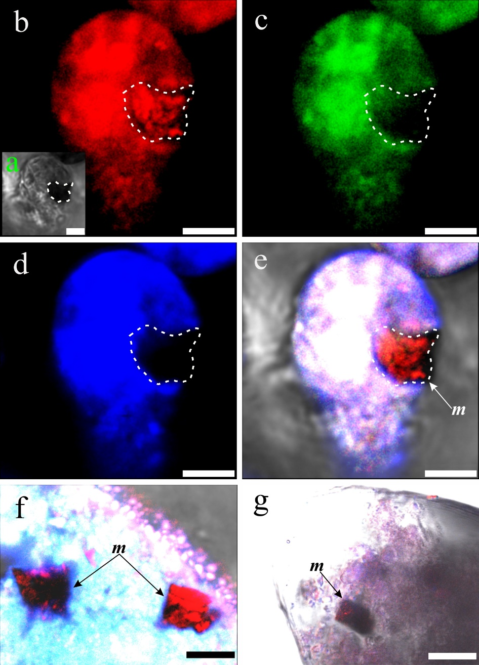 圖3 R. bilocularis廢物球中的磁鐵礦(m)被脂類膜包裹。(a) 廢物球的反射光顯微照片。(b) 蘇丹IV染色的廢物球的CLSM圖像,脂類顯紅色。(c) 鬼筆環(huán)肽染色的廢物球的CLSM圖像,肌動(dòng)蛋白顯綠色。(d) DAPI染色的廢物球的CLSM圖像,DNA顯藍(lán)色。(e) 圖b-d的耦合圖像。一個(gè)被脂類膜包裹的磁鐵礦顆粒被蘇丹IV染呈紅色。(f, g) 耦合圖像顯示被脂類膜包裹的磁鐵礦顆粒被蘇丹IV染呈紅色。磁鐵礦用箭頭和m標(biāo)記。比例尺f = 5 μm,g = 10 μm,其他= 2.5 μm。