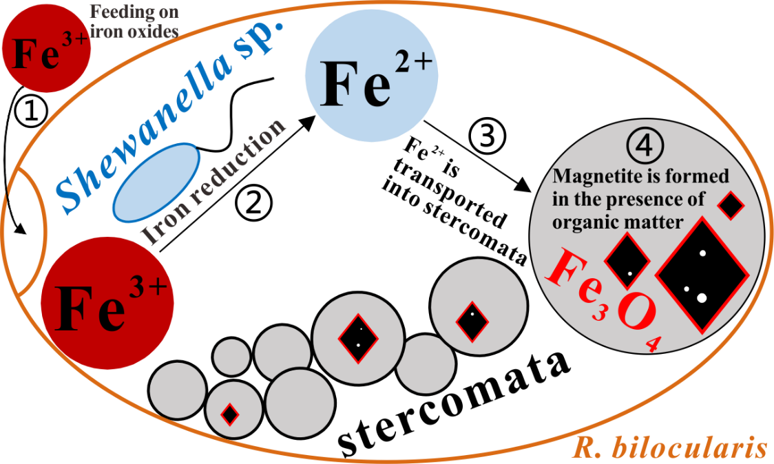 圖4 R. bilocularis磁鐵礦成因的概念模型。1)有孔蟲(chóng)攝食含有鐵氧化物(Fe3+)的沉積物。2) 鐵還原細(xì)菌Shewanella sp. 將Fe3+還原為Fe2+。3) Fe2+被轉(zhuǎn)移到廢物球中。4) 形成含有機(jī)物的多孔狀磁鐵礦。紅色多邊形代表包裹磁鐵礦的有機(jī)質(zhì)膜。