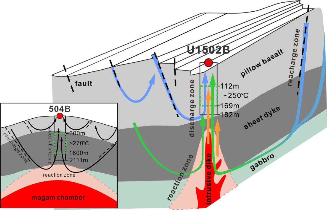 通過綠簾石脈的巖相學和地球化學特征,結合區域地質背景,本研究認為U1502B鉆孔基巖綠簾石脈的形成可能與南海的初始擴張相關。與典型的洋中脊熱液系統不同,U1502B鉆孔的熱液系統以侵入巖墻作為熱源,以海底擴張初期在初始洋殼形成的正斷層作為流體遷移通道;在侵入巖墻的加熱下,高溫熱液、巖漿流體與改性海水混合上涌在洋殼淺部的熱液釋放區形成綠簾石脈(圖4)。該項工作彌補了利用陸地非原位體系綠簾石示蹤熱液循環系統的不足;同時也證明了洋殼綠簾石化現象不僅限于洋中脊熱液系統,也可以發生在與海底擴張初期拉張活動相關的熱液活動中,完善了對于海底熱液循環系統的認知。