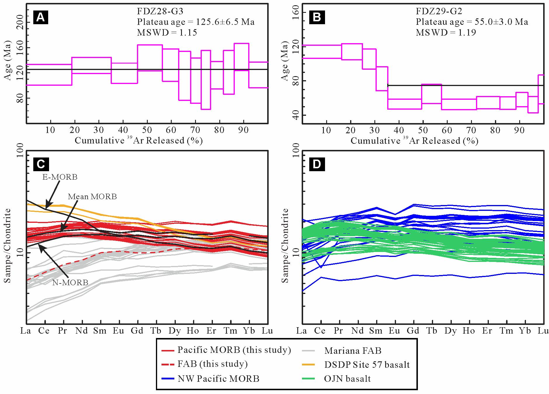2. 樣品年齡及REE配分模式。西北太平洋洋中脊玄武巖(Pacific MORB)、馬里亞納弧前玄武巖(Mariana FAB)、翁通爪哇高原玄武巖(OJN basalt)和卡羅琳板塊玄武巖(DSDP Site 57 basalt)等引用數據來自于GEOROC數據庫,同圖3