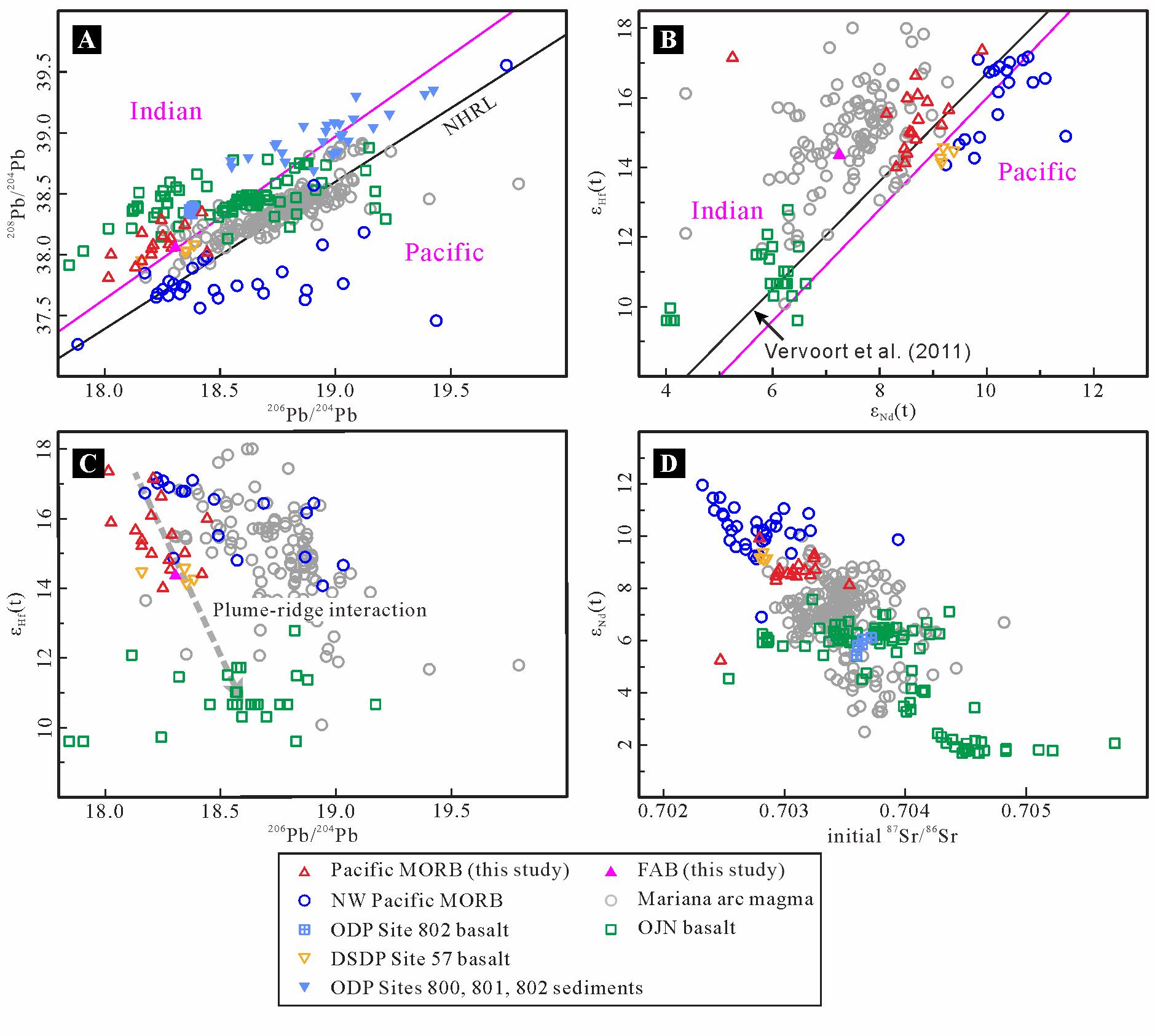 此項研究有以下3個方面的重要認識:(1)早白堊世太平洋MORB發育印度洋型地幔域同位素特征。研究樣品具有與其他西北太平洋MORB相似的微量元素和Hf同位素組成,但略微富集不相容元素,具有略微富集的Sr–Nd–Pb同位素組成,表現出印度洋型地幔域同位素特征——這些特征可能是地幔柱洋中脊相互作用的產物。(2)馬里亞納海溝俯沖大洋板片在弧巖漿成分多樣性形成過程中起著關鍵作用本研究明確了具有印度洋型地幔域同位素特征的早白堊世太平洋MORB是馬里亞納弧巖漿Pb元素組成的重要端元之一。(3)馬里亞納海溝最南部俯沖起始時間可能在55Ma。來自挑戰者深淵北部的一件弧前玄武巖(FAB)樣品給出40Ar/39Ar年齡為55.0 ±3.0 Ma——IBM初始俯沖時間在誤差范圍內一致,考慮到以往研究樣品采集深度均淺于7000m深度,馬里亞納海溝最南端俯沖起始時間可能提前到55Ma