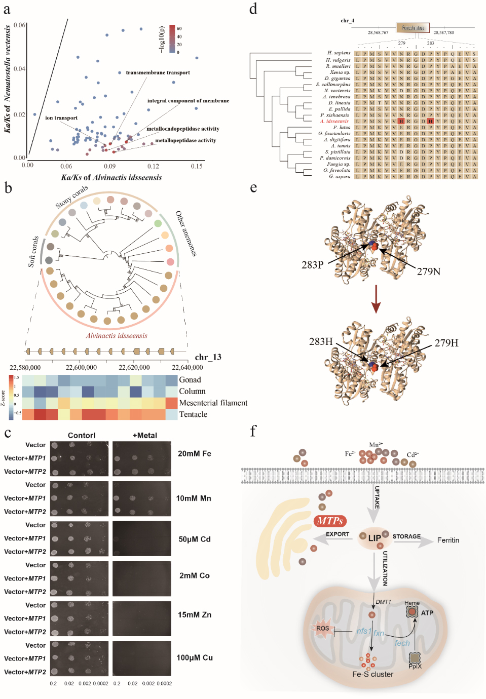 研究團隊通過比較基因組分析發現,該海葵基因組中分別有736/31個基因家族顯著擴增/收縮。擴增基因家族主要與金屬離子的結合、細胞膜和應激反應相關,其中與金屬離子耐受相關的MTPs基因家族顯著擴張,轉錄組分析發現大多數MTP基因主要在觸手中表達。由于MTP基因在無脊椎動物中研究較少,為了更好地了解MTPs的功能,研究人員利用酵母表達系統對其進行功能驗證,結果發現攜帶MTP的酵母細胞只能在含有高濃度Fe2+Mn2+的培養基中生長,這證明MTP可以幫助該海葵耐受Edmond熱液口環境中高濃度的Fe2+Mn2+