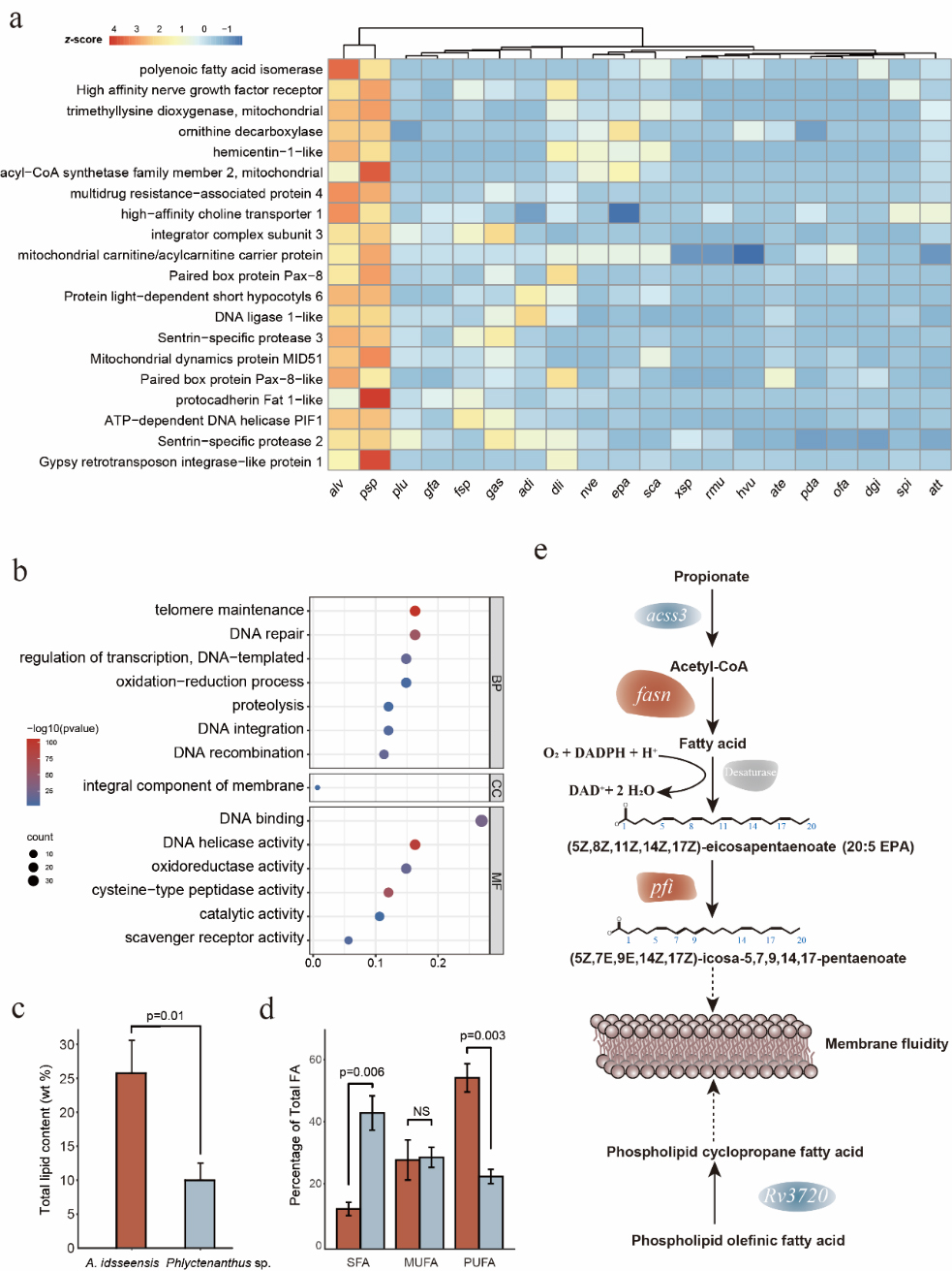 高靜水壓力會影響細胞膜流動性、蛋白質穩定性、DNA 結構和細胞骨架等,該研究結合團隊已發表的深海海葵(Paraphelliactis xishaensis)基因組,通過分析發現在兩個深海海葵中有22個基因家族發生了共同擴張,富集分析發現這些基因家族與DNA修復和細胞膜有關。為進一步分析高靜水壓力對于細胞膜功能的影響,研究人員比較了該海葵和淺海海葵的總脂含量,發現該海葵相對于淺海海葵具有較高含量的多不飽和脂肪酸。有趣的是,參與不飽和脂肪酸合成的多個基因(fasn, acss3, pfi,Rv3720)發生了改變,其中fasn 基因在馬里亞納獅子魚Pseudoliparis swirei 基因組中同樣發生擴張,這可能是深海生物應對高靜水壓力的趨同進化。