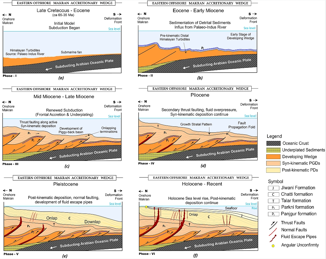 Summarized model specific to Makran accretionary wedge evolution. These illustrate the evolution of inferred deformation of thrust wedge, tectonically-induced fluid overpressure, and deformation pattern of wedge-top sedimentary depositional systems  (north to south).