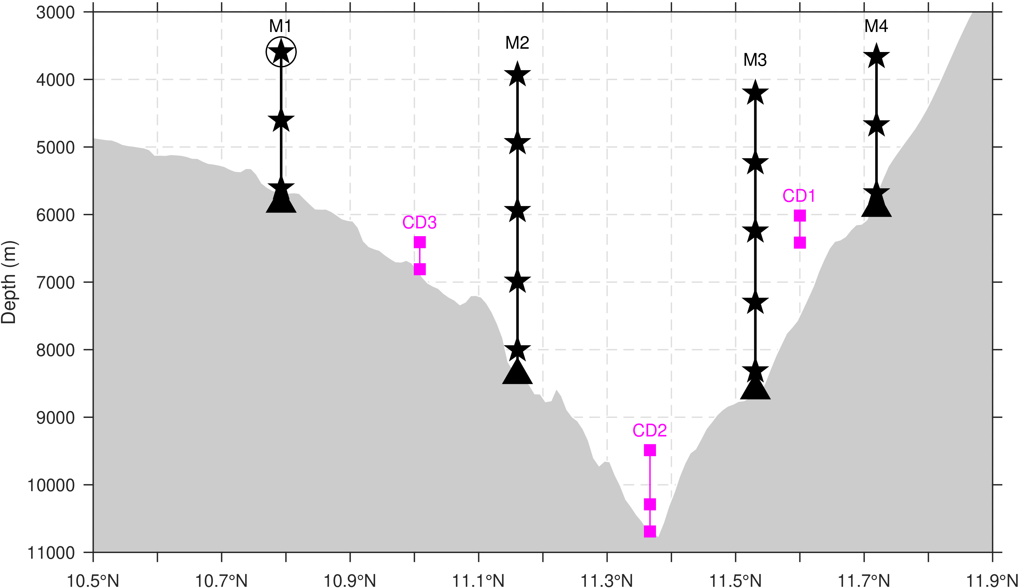 圖1. “挑戰者”深淵位置和潛標站位置、以及西太平洋深層環流示意圖