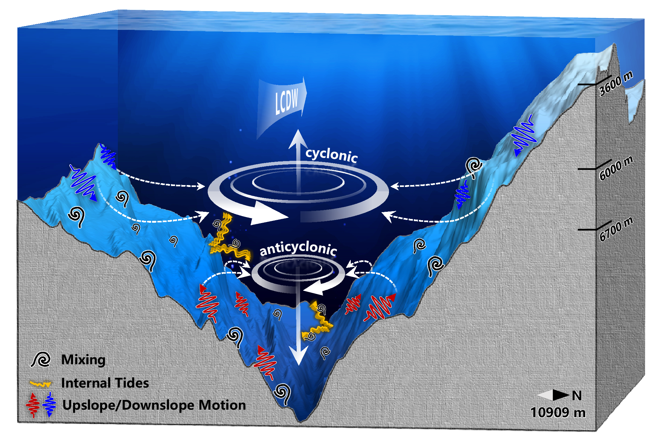 “挑戰者”深淵是世界上最深的深淵海溝。來自南大洋的低層繞極深層水(LCDW)經由這一關鍵樞紐侵入雅浦海溝和菲律賓海盆(圖1),從而對局地環境產生重要影響。由于極端深度環境下采樣十分困難,目前仍不清楚“挑戰者”深淵的LCDW輸送和深層環流結構。為了探究上述科學問題,研究室聯合中國海洋大學深淵研究團隊在“挑戰者”深淵布放了萬米級潛標陣列進行長時間流速觀測(圖2上)。通過分析海流數據,研究發現“挑戰者”深淵3600米以深存在三層環流結構,自上而下分別為西向流、氣旋式環流以及反氣旋式環流(圖2下)。西向流在夏季轉為東向,表明深海盆之間存在雙向連通性,而氣旋式環流和反氣旋式環流則相對穩定。結合潛標觀測、數值試驗和前人發現的分析結果表明,該環流結構是由LCDW入侵、局地特殊地形以及底部強湍流混合共同作用而形成。其中,底部強湍流混合在驅動反氣旋環流方面起到關鍵作用。
