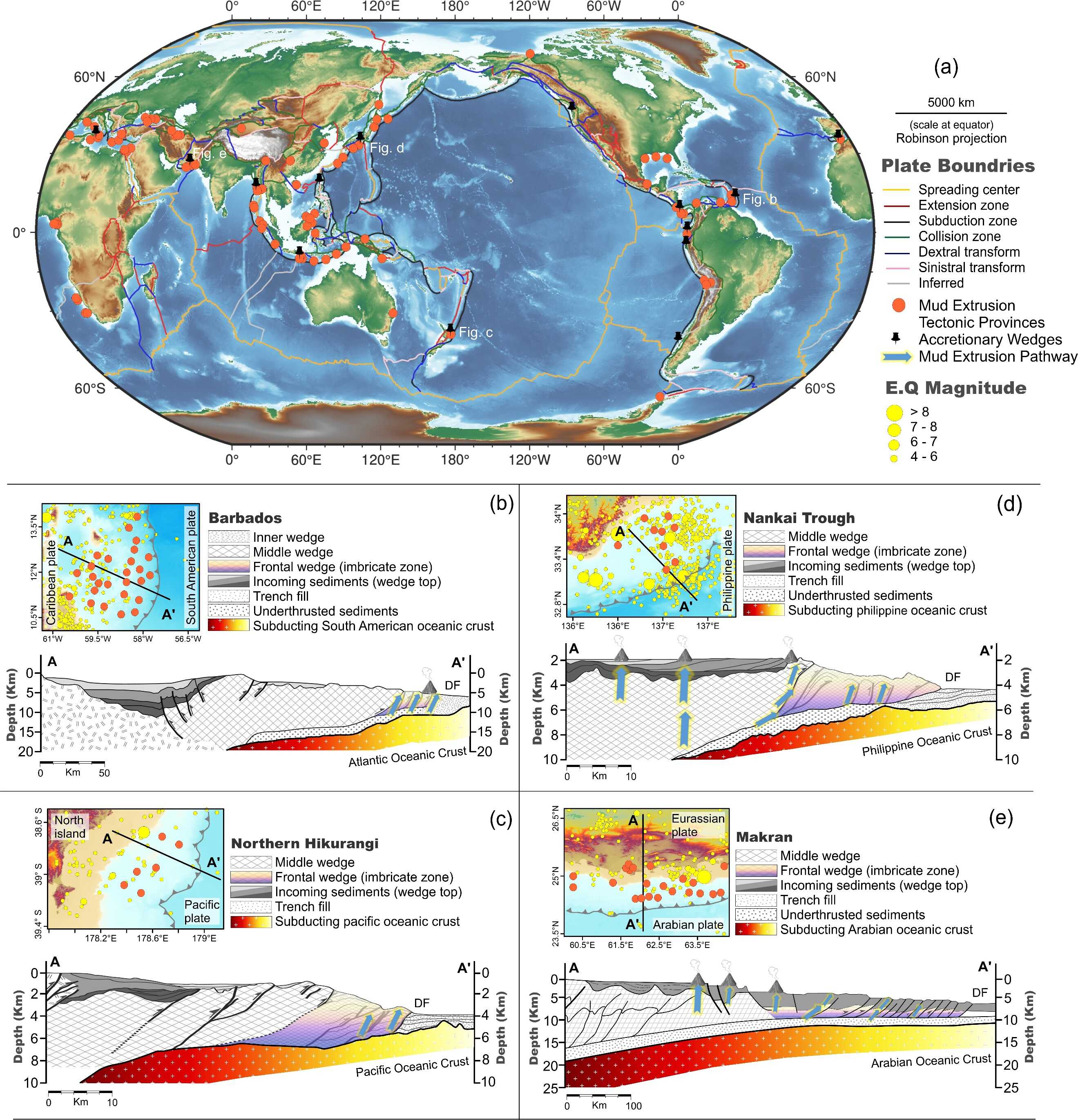 圖2.?(a) 全球富 CH? 泥火山的構(gòu)造區(qū)域;(b-e) Barbados、Northern Hikurangi、Nankai Trough 和 Makran Accretionary Wedges 的示意剖面圖