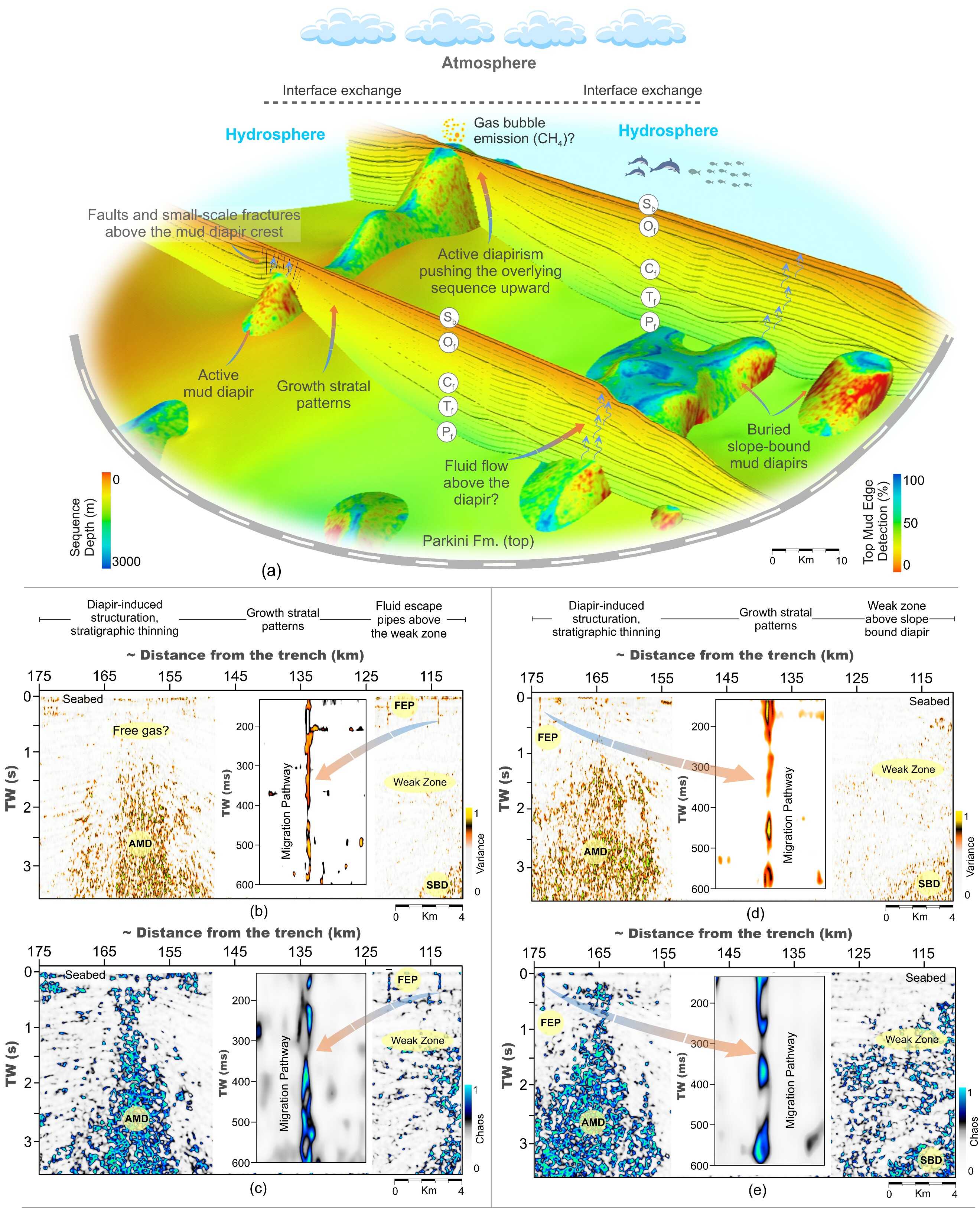 圖3.?Makran Subduction Zone 中泥底辟和流體逃逸管的三維結(jié)構(gòu)及多屬性地震特征