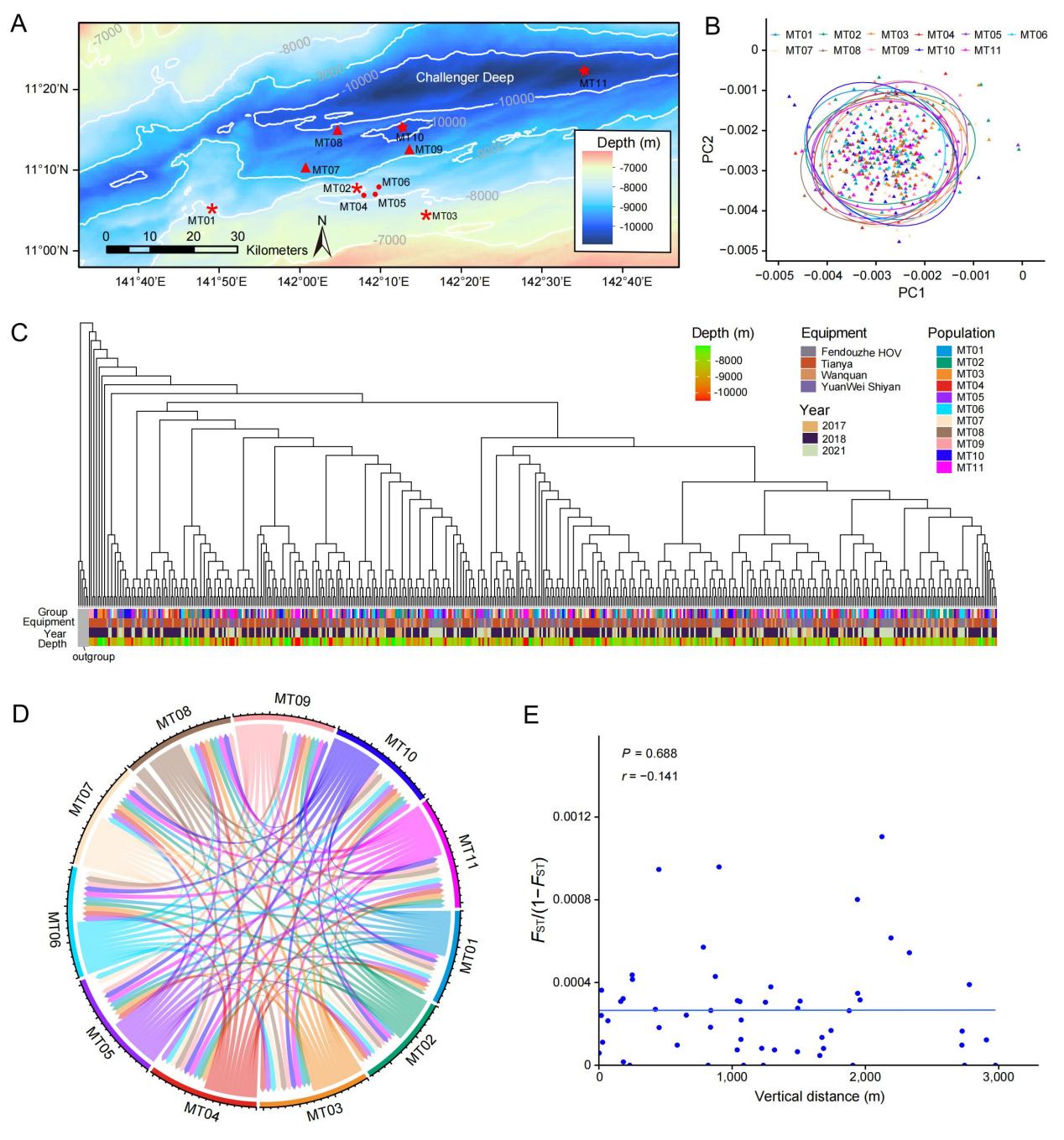 研究團(tuán)隊(duì)對(duì)馬里亞納海溝的510只(11個(gè)群體)、雅浦海溝94只(1個(gè)群體)及西菲律賓海盆深淵區(qū)的18只(1個(gè)群體)H. gigas個(gè)體進(jìn)行了高覆蓋的全基因組重測(cè)序和群體遺傳學(xué)分析。結(jié)果顯示來(lái)自馬里亞納海溝11個(gè)不同深度(~7000-11000米)群體不存在遺傳分化,表明生活在馬里亞納海溝內(nèi)的鉤蝦是一個(gè)完全混合的群體,高靜水壓不會(huì)限制其在海溝內(nèi)的垂直遷移。而西菲律賓海盆的鉤蝦群體與馬里亞納海溝的群體則表現(xiàn)出明顯的遺傳分化。這兩個(gè)海溝間相隔~(yú)1500公里,表明地理隔離阻礙了群體間的基因交流。