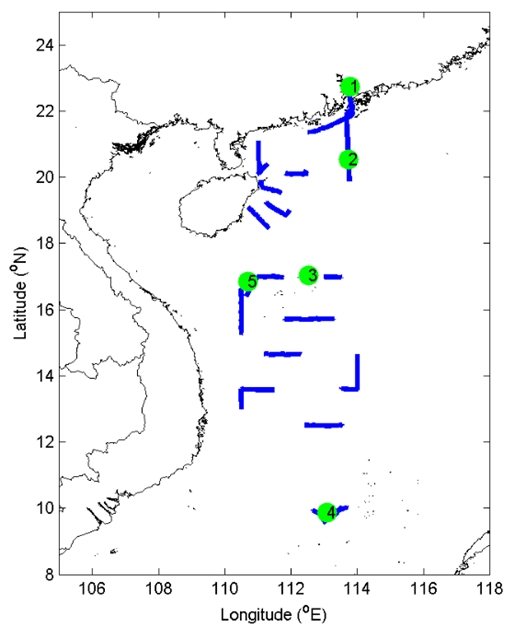 (藍色線條為本航次鯨豚類動物考察航跡,數(shù)字為海豚發(fā)現(xiàn)地點)