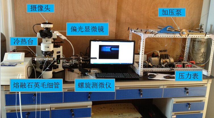 該實驗室利用已具備的技術(shù)條件,通過購買實驗平臺所需的設(shè)備和材料自行搭建組裝,于2014年9月,在周義明研究員的指導(dǎo)下完成了深淵水體、熱液及冷泉環(huán)境模擬實驗平臺的搭建,目前已投入使用。在現(xiàn)有設(shè)備條件下,計劃開展不同地質(zhì)流體的飽和蒸汽壓觀測實驗。在毛細管內(nèi)運用汞封技術(shù)制備封閉待測樣品,并與控溫、加壓系統(tǒng)相連接,在體視鏡下實現(xiàn)對不同地質(zhì)流體飽和蒸汽壓的觀測。